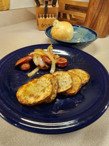 Sausage, Onions, PotatoesNo griddle? The skillet works to. Cook potatoes separately. Get the sausage going and browning then add onion and cover until the onion is to desired tenderness.